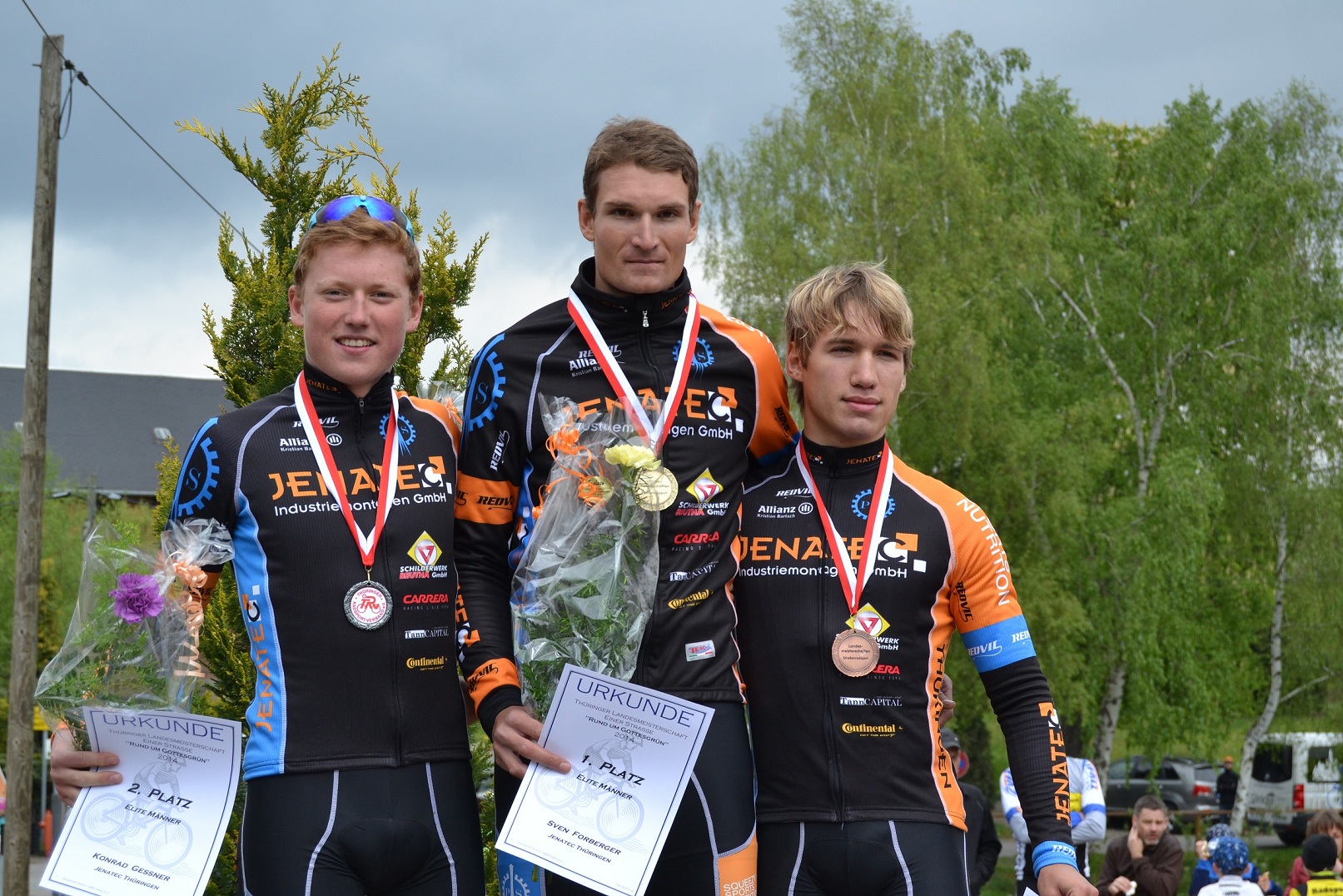 Sven Forberger wird Thüringer Landesmeister Am Samstag, den 03.05.2014, ging es für einen Teil der Mannschaft in die Lutherstadt Wittenberg zum ersten Radrennen in diesem Jahr mit Profis wie John Degenkolb (GIANT- Shimano) und Rick Zabel (BMC Racing Team) Sohn von Erik Zabel (ehemaliger Profi Team Telekom). Das Rennen ging über 63km auf einem Rundkurs in der Innenstadt von Wittenberg. Start und Ziel war auf dem sehr gut von Zuschauern und Presse besuchten Markt. „Die Stimmung war großartig und mit Profis ein Rennen zu bestreiten, war für uns als Team eine ganz neue Situation, aus der wir nur lernen konnten.“ (Sportler: Sven Forberger) Über den Rennverlauf hinweg zeigten sich die Teams in Ausreißer Gruppen und einzelnen Attacken. 10 Runden vor der Zieleinfahrt konnte sich jedoch eine 12 Mann Gruppe vom Feld absetzen. Mit dabei Lukas Steger vom JENATEC THÜRINGEN Team, sowie Rick Zabel (BMC Racing Team) und John Degenkolb (GIANT Shimano). Lukas konnte sich im Rennverlauf von der Gruppe kurz absetzen und einen Prämienspurt für sich entscheiden. Zum Zieleinlauf fehlte ihm aber der „Punsch“, um bei den Profis mit zu halten. Es gewann John Degenkolb vor Rick Zabel und Renzo Wernicke (Team Ur-Krostitzer – GIANT). Lukas kam auf Platz 11 in das Ziel. Am Sonntag den 04.05.2014 startete das komplette, bis auf zwei erkrankte Fahrer des Teams, bei der Thüringer Landesmeisterschaft auf der Straße in Greiz/ Mohlsdorf. Das Rennen ging über bergige 83km auf einem ca. 7km langen Rundkurs. Die Ansage des Trainers Lars Wackernagel ging auf Sieg. Diese Ansage setzte das Team um in dem die Sportler durch ständige Attacken aus dem Fahrerfeld den anderen Sportlern das Rennen schwer machten. Als dann 5 Runden vor Schluss Sven Forberger antritt, konnte keiner sein Hinterrad halten. Er kämpfte sich allein über die verbleibenden Kilometer und kam mit einem Vorsprung von 4Minuten ins Ziel. „ Ich bin sehr froh über diesen Sieg. Das gibt mir Auftrieb und ich merke auch, dass meine Form langsam wieder besser wird“ (Sven Forberger) Die anderen Sportler des Teams kontrollierten derweil das Fahrerfeld. Beim Zielsprint nach 83km konnte sich Konrad Gessner mit einem kleinen Vorsprung zur Verfolgergruppe Platz 2 und Nils Schachtebeck Platz 3 erkämpfen. Das ist ein Ergebnis welches ich so nicht erwartet habe, mich aber sehr glücklich stimmt. Das Team hat gezeigt, das wir als Mannschaft stark sind und gemeinsam großes bewirken können. ( Manager: Martin Brand) Am Sonntag den 11.05.2014 startet das Team beim 2. Bundesligarennen im Erzgebirge zur „Erzgebirgsrundfahrt“ Text & Foto: Martin Brand – JENATEC THÜRINGEN