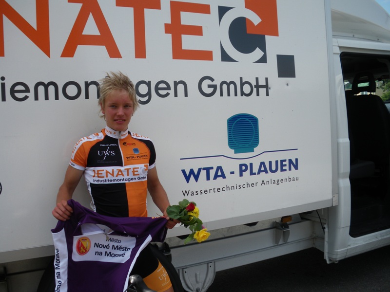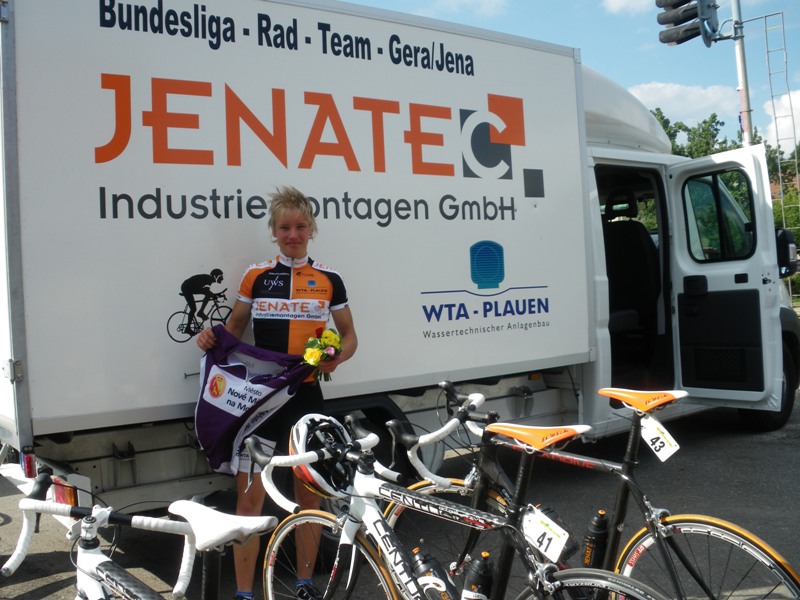 Zur Vorbereitung auf die Deutschen Bergmeisterschaften Ende August bestritt das Jenatec Cycling Team vergangene Woche erfolgreich die viertägige Vysocina-Rundfahrt in Tschechien. Bereits auf der ersten Etappe holte Philipp Rechenbach einen sensationellen zweiten Platz und schlüpfte ins Sprinttrikot. Kurz vor dem Ziel der 120km-Etappe hatte er sich aus einer 7-köpfigen Spitzengruppe gelöst und wurde auf der Zielgeraden nur noch von Matthias Friedemann aus dem Profiteam PSK Whirlpool abgefangen. Nach vier bergigen Etappen durch die tschechische Skiregion Nove Mesto und einem Zeitfahren sicherte sich Rechenbach in der Gesamtwertung eine erfreulichen 19. Platz. Das erlesene 120 Mann starke Fahrerfeld, bestehend aus tschechischen Spitzenfahrern und zahlreichen deutschen Teams, hatte sich zum Ende merklich ausgedünnt. Weniger als 70 von ihnen erreichten nach den 530 Kilometern das Ziel in Zdar südöstlich von Prag, darunter die drei Jenatec-Fahrer Rechenbach (19.), Kästner (52.) und Karl (57.).