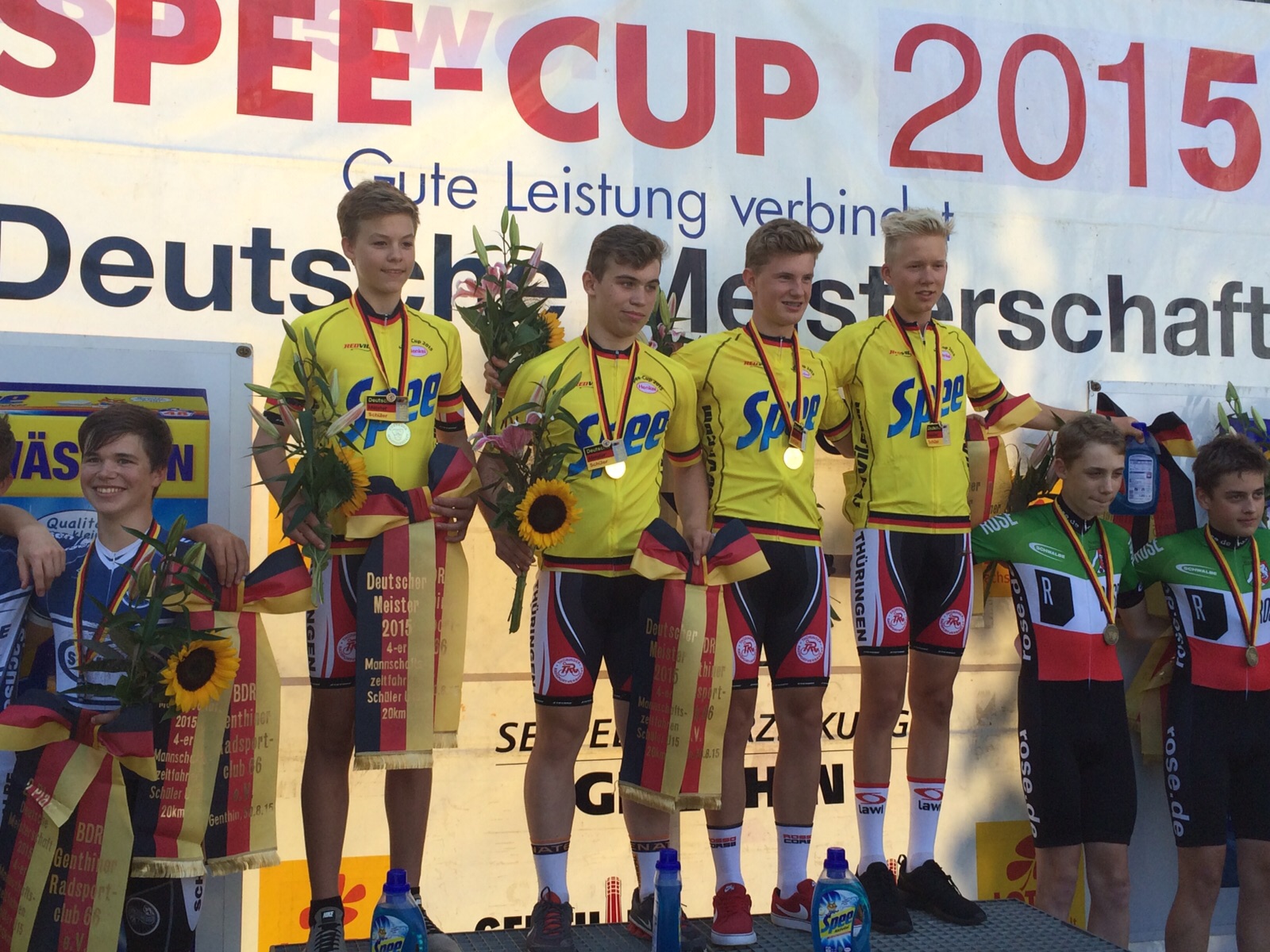 Eine Stunde später haben dann die Jungs der Thüringer Auswahl mit Paul Groch (SV Sömmerda), Julien Jäger (RSC Turbine Erfurt), Domenik Wolf (SSV Gera) und Tim Oelke (RSV BW Meiningen) nachgelegt und wurden Deutsche Meister im 4er Mannschaftszeitfahren der U15-Schüler.