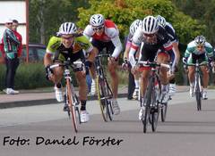 Sven Forberger hatte seinen Siegeszug etwa zur Hälfte des Rennens der Elitefahrer (KT und A-/B-/C-Klasse) gestartet. „Bis dahin hatte ich auf eine gute Gelegenheit gewartet, um zu attackieren zu können. Bei meiner Offensive habe ich alle Körner rausgehauen, die ich hatte“, sagte der Sieger auf dem Treppchen. Das hatte sich gelohnt: Er war auf der Ein-Kilometer-Schleife im Gewerbegebiet des Bornaer Ortsteils dem Peloton davon gefahren. Nur ein Chemnitzer Fahrer vom Team Graakjaer - DKV (Thüringen) war an seinem Hinterrad geblieben. Bis dahin hatten einige andere Rennfahrer mit Sprints aus dem Hauptfeld gepunktet. Souverän gewann Sven Forberger bis zum Schluss alle Wertungen. Sein Kontrahent gab etwa zehn Runden vor Ende auf, so dass Forberger das Rennen nach 1:20:08 Stunden im Alleingang und mit einem enormen Punktestand von 45 Zählern beendete. Den Vorsprung des Ausreißerduos von zunächst 20 Sekunden auf das Feld konnte er zwischenzeitlich noch einmal vergrößern. Erik Mohs holte 27 Punkte, Steffen Radochla 16 Punkte. (df)